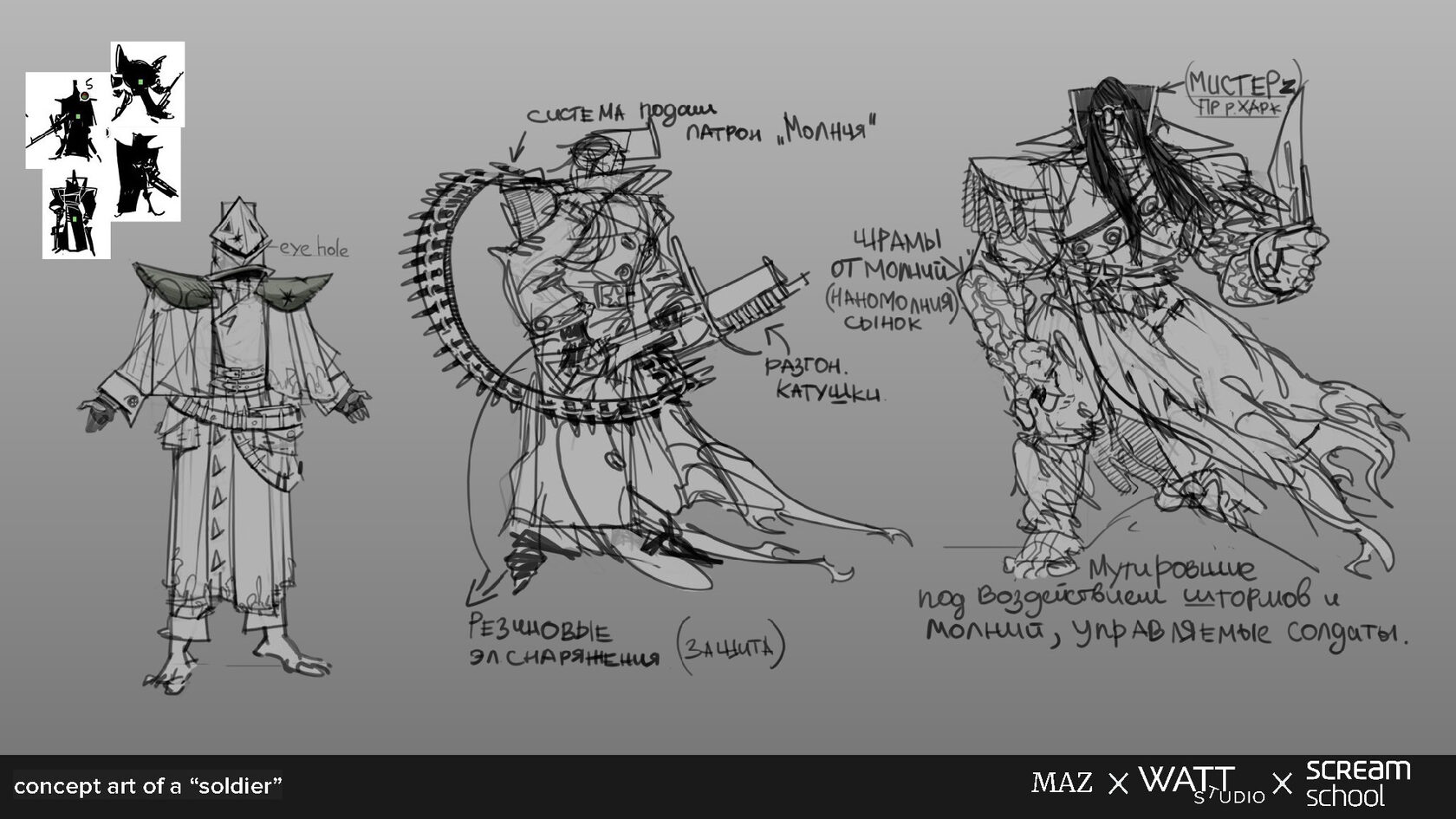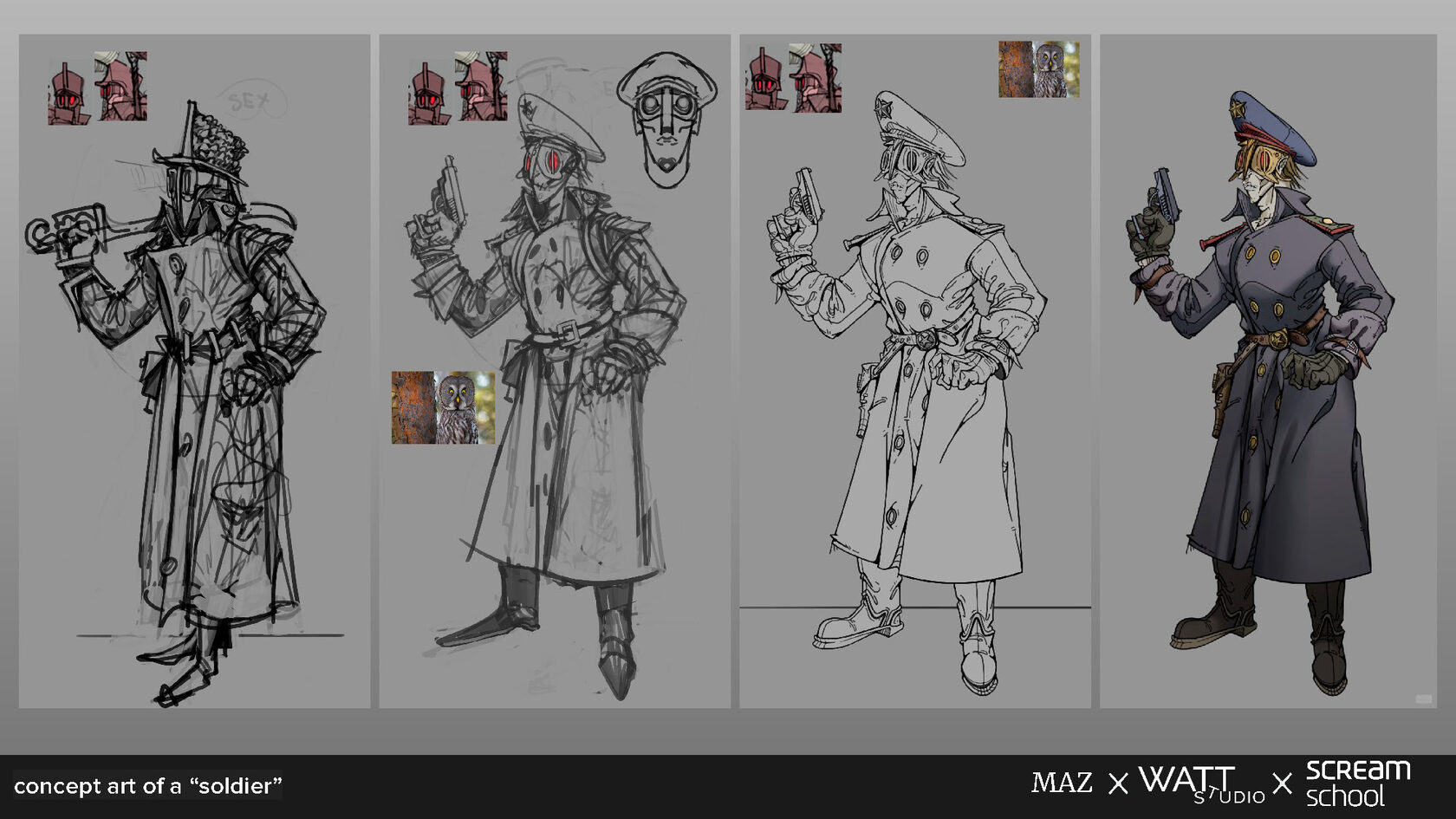 - Разработка NPC-противника (солдат) — персонаж с маской-шлемом, шинелью и поясными сумками.