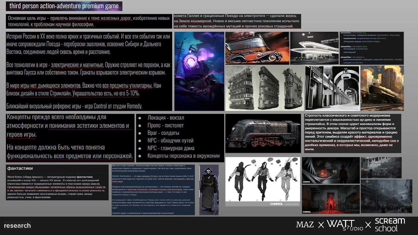 Проект выполнен по брифу предстоящей игры Trains Electrostorm, где игрока ждёт история в сеттинге электротехно-панка и атмосферного ретрофутуризма. Студент сосредоточился на создании ключевых визуальных элементов игры — локации, персонажей и оружия — с целью передать уникальную атмосферу мира, в котором героиня взаимодействует с окружающими NPC и элементами окружения.