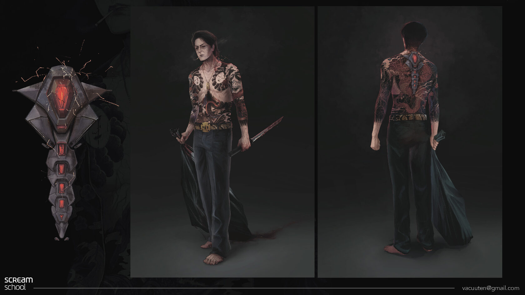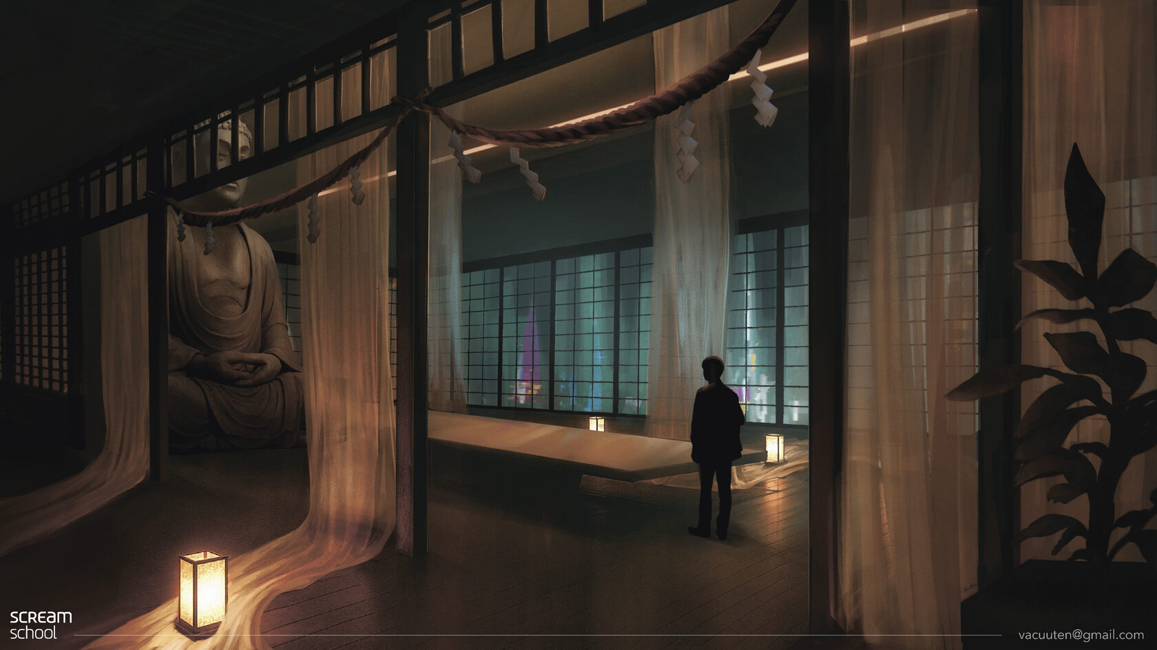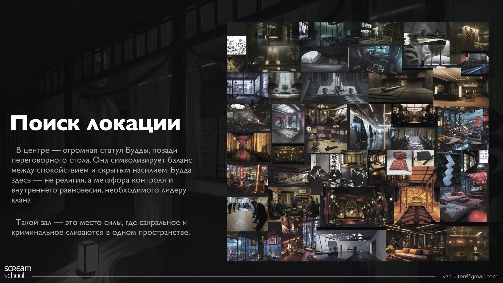 Согласно брифу, Мария проработала концепт персонажа Босс, локацию и промо-арт. Центром локации она выбрала статую Будды, которая символизировала баланс между умиротворением и скрытым насилием.