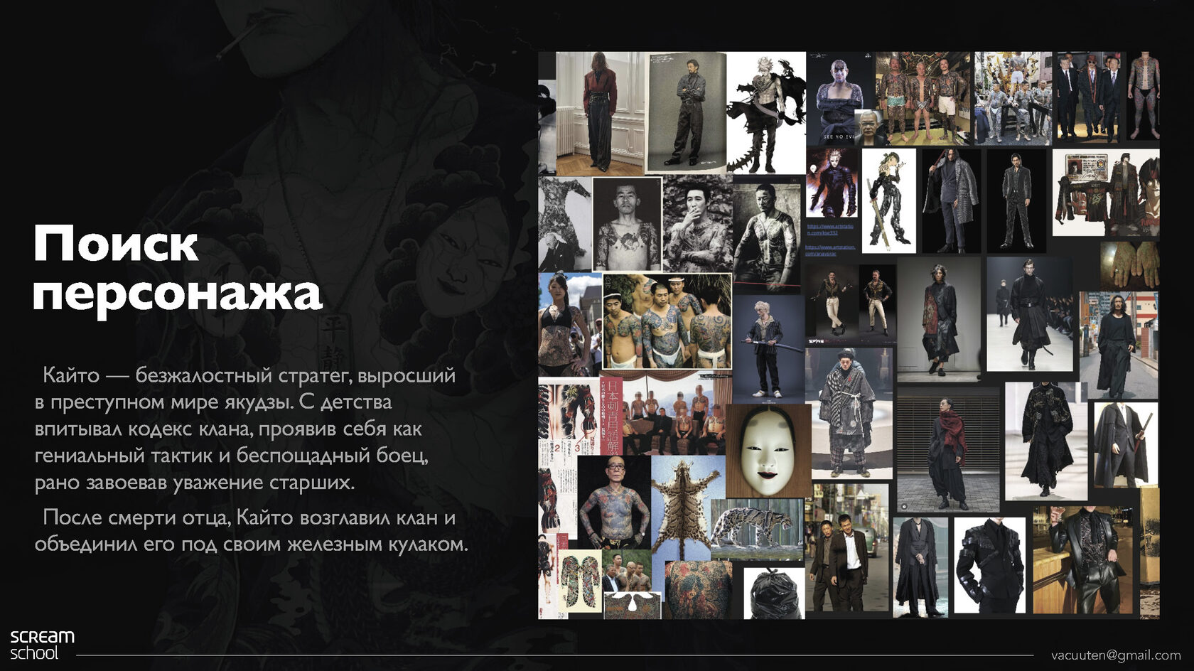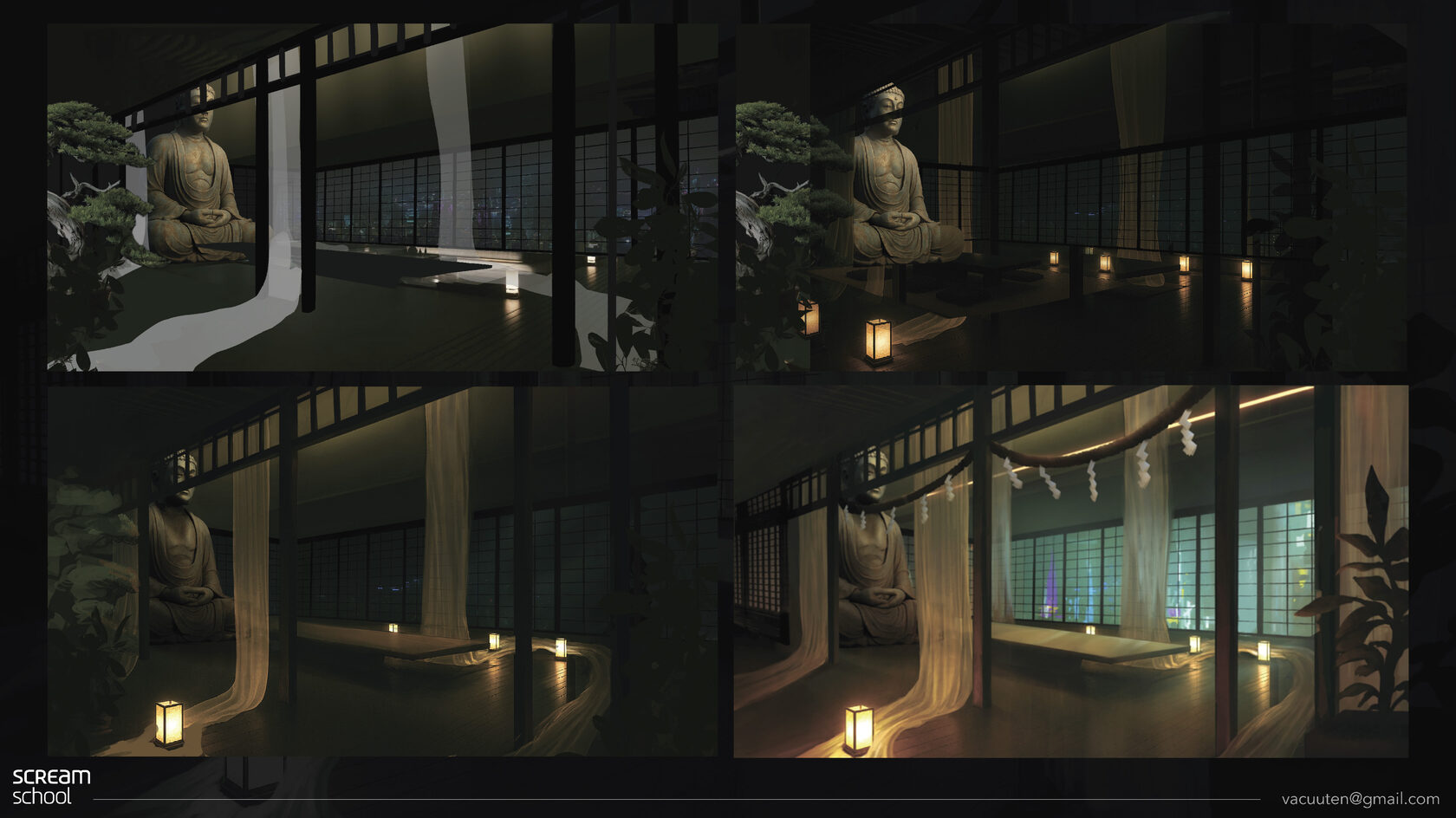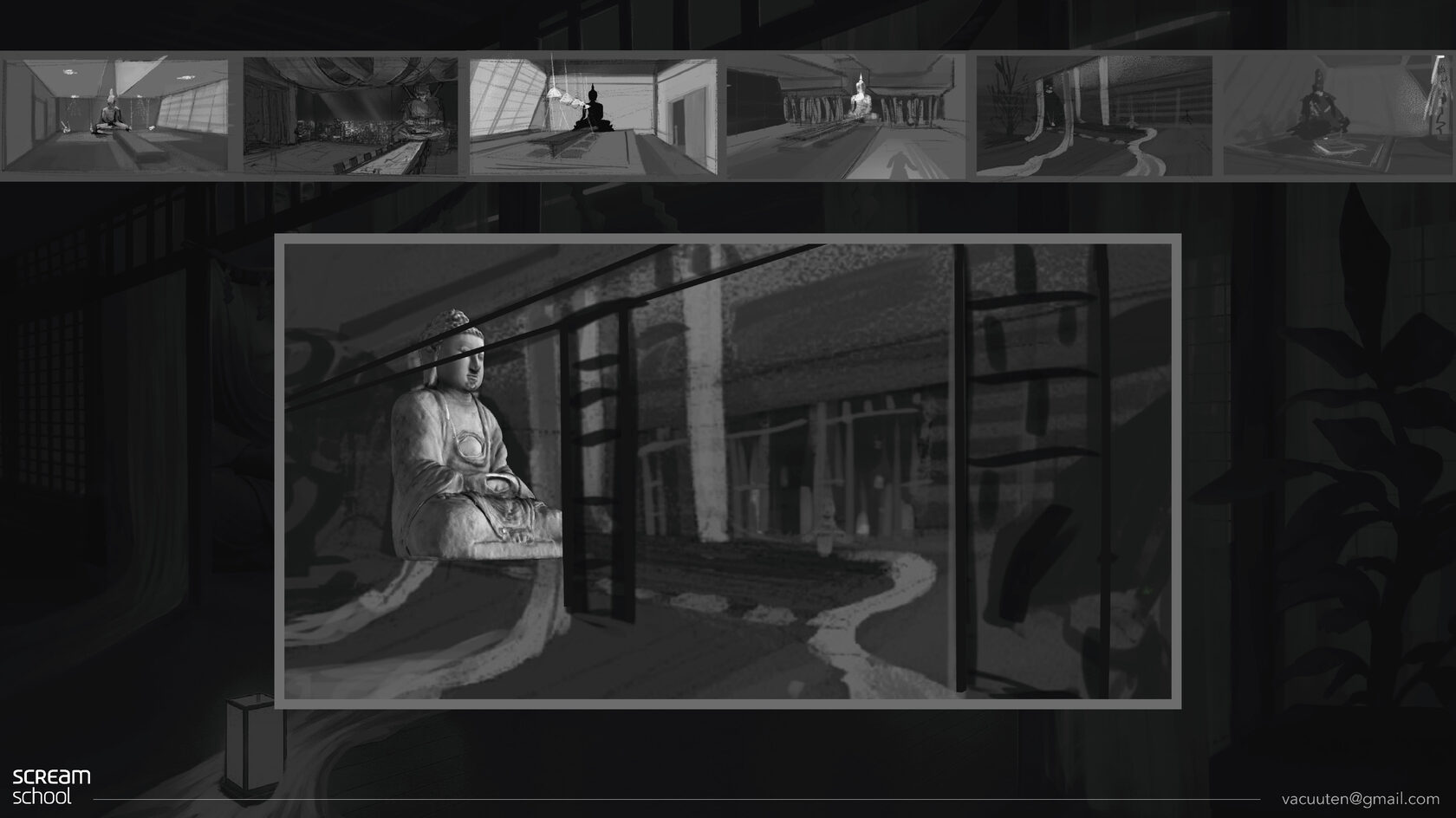 Согласно брифу, Мария проработала концепт персонажа Босс, локацию и промо-арт. Центром локации она выбрала статую Будды, которая символизировала баланс между умиротворением и скрытым насилием.
