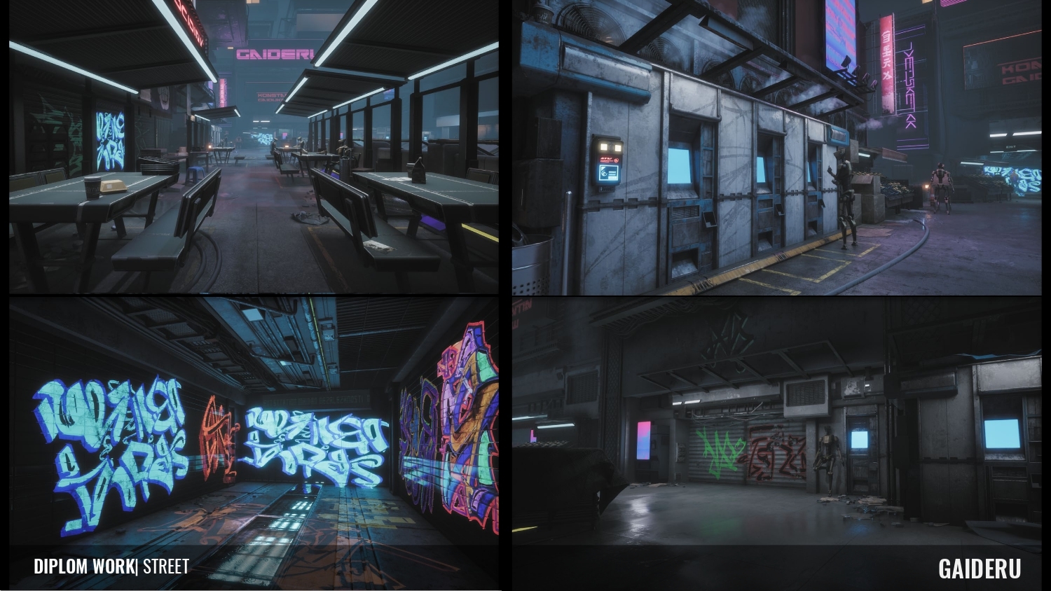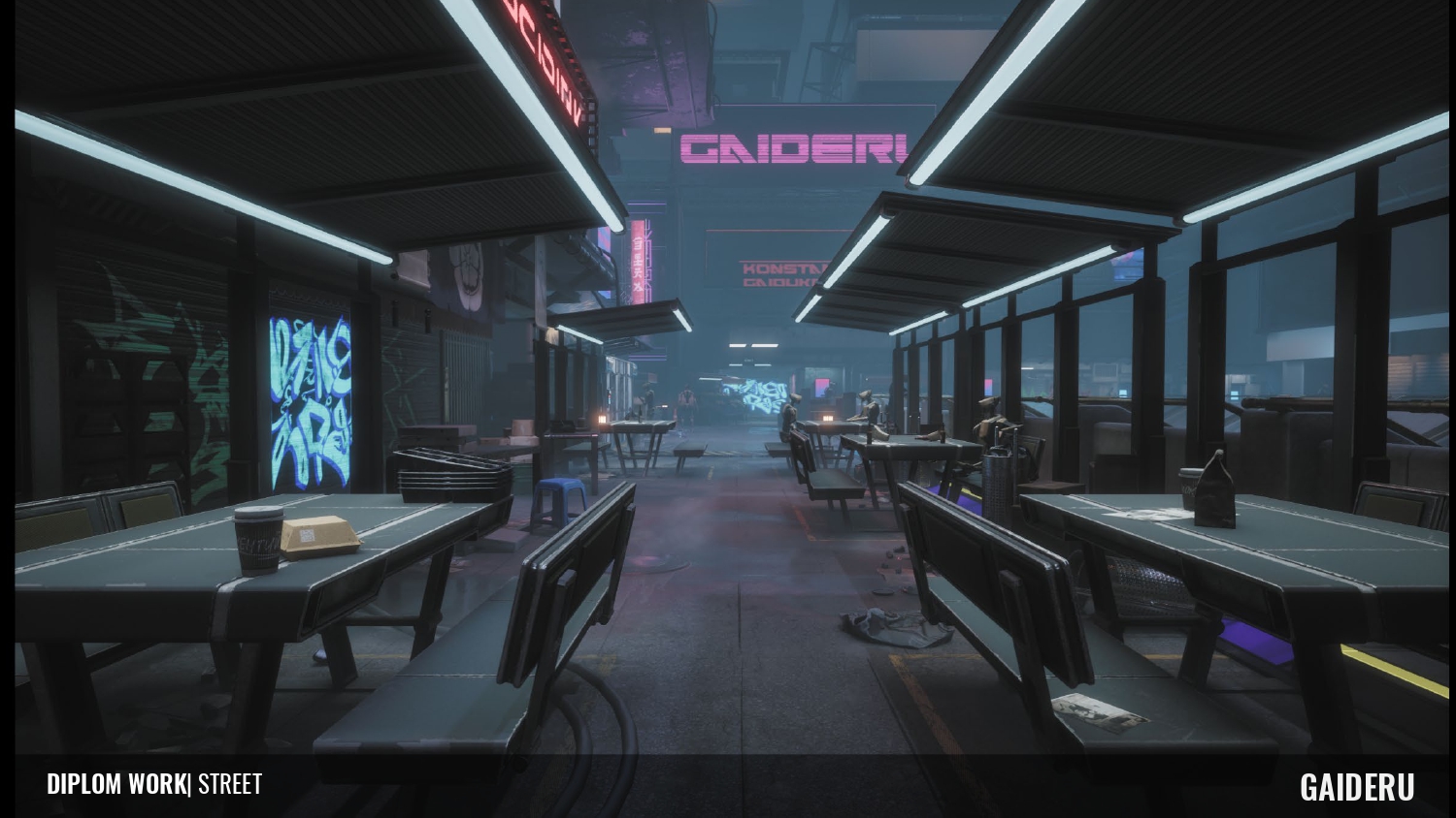 В рамках задания он собрал городское пространство с индустриальной архитектурой, неоном и уличными деталями. В работе показана проработка окружения, модульных элементов и общего визуального стиля сцены.